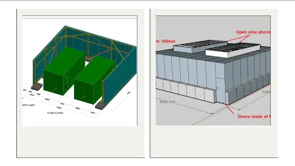 Пројекат је почео са једноставним описом: клијент је првобитно захтевао акустично кућиште изграђено са три зида и без крова, са циљем смањења буке уз одржавање отворене вентилације изнад чилера. Наши инжењери су направили детаљан модел ове конфигурације и спровели прелиминарне акустичне симулације .